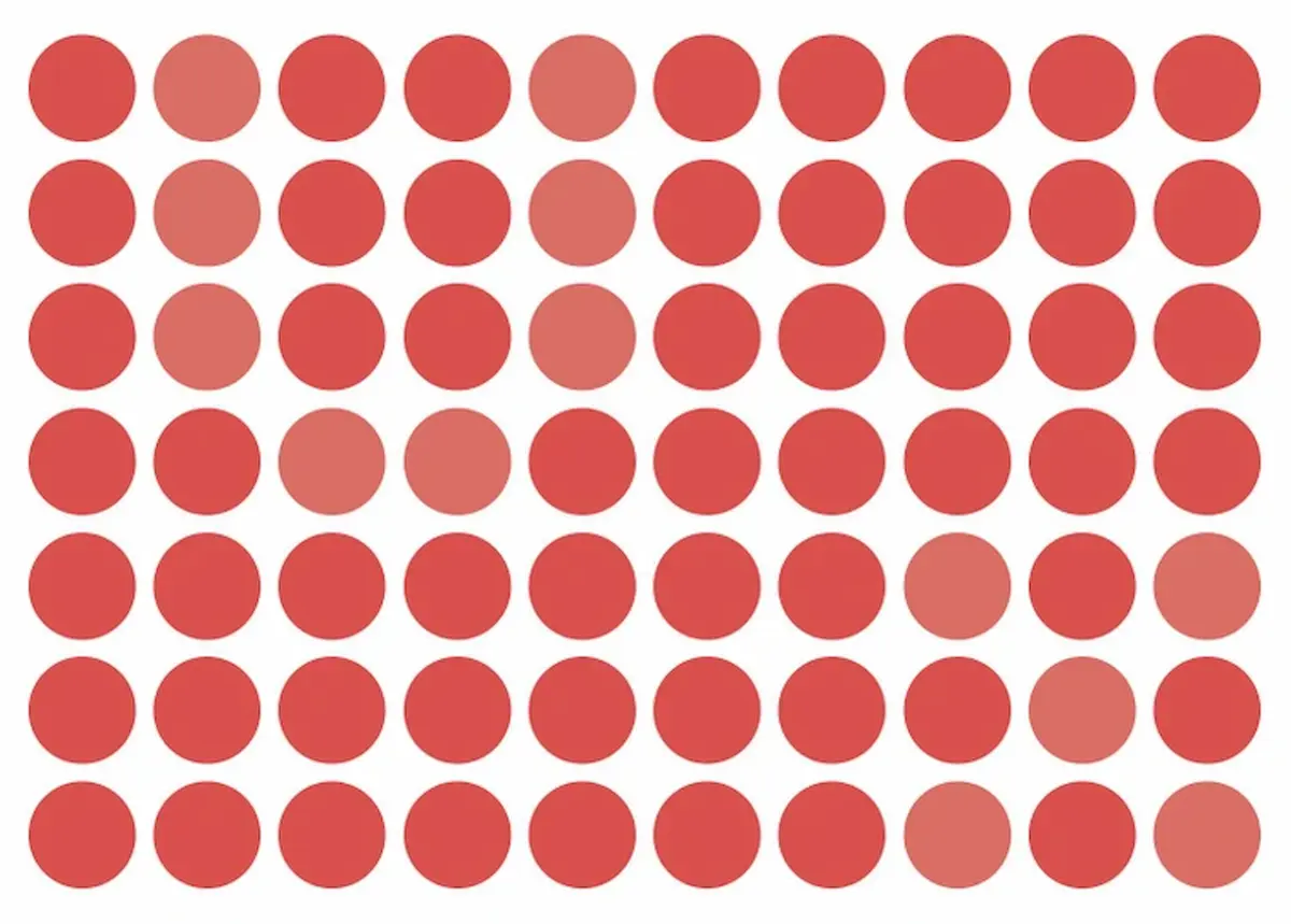 Procure variações de tom, não de forma: as letras surgem pela diferença sutil entre círculos vermelhos mais claros e mais escuros.